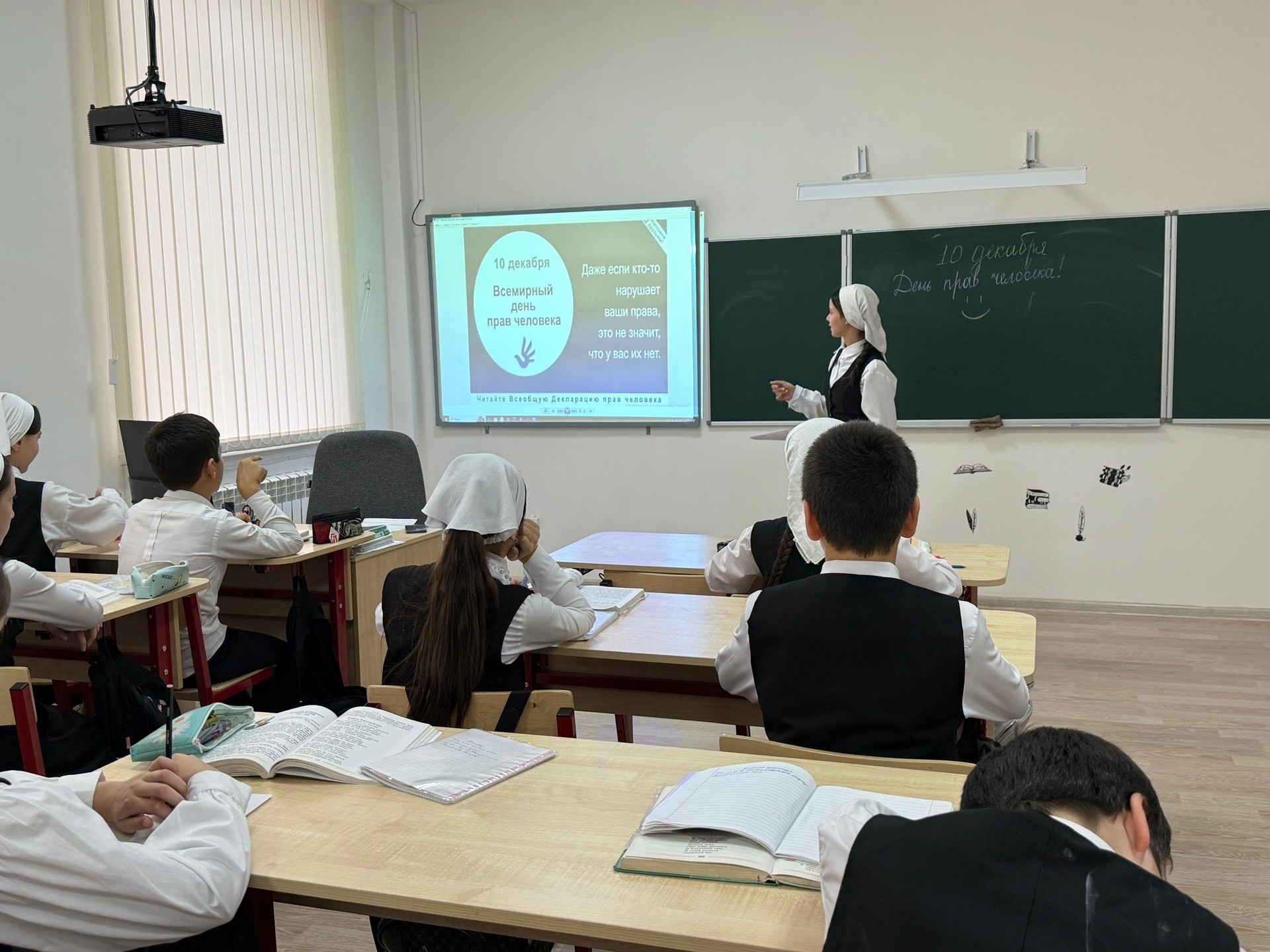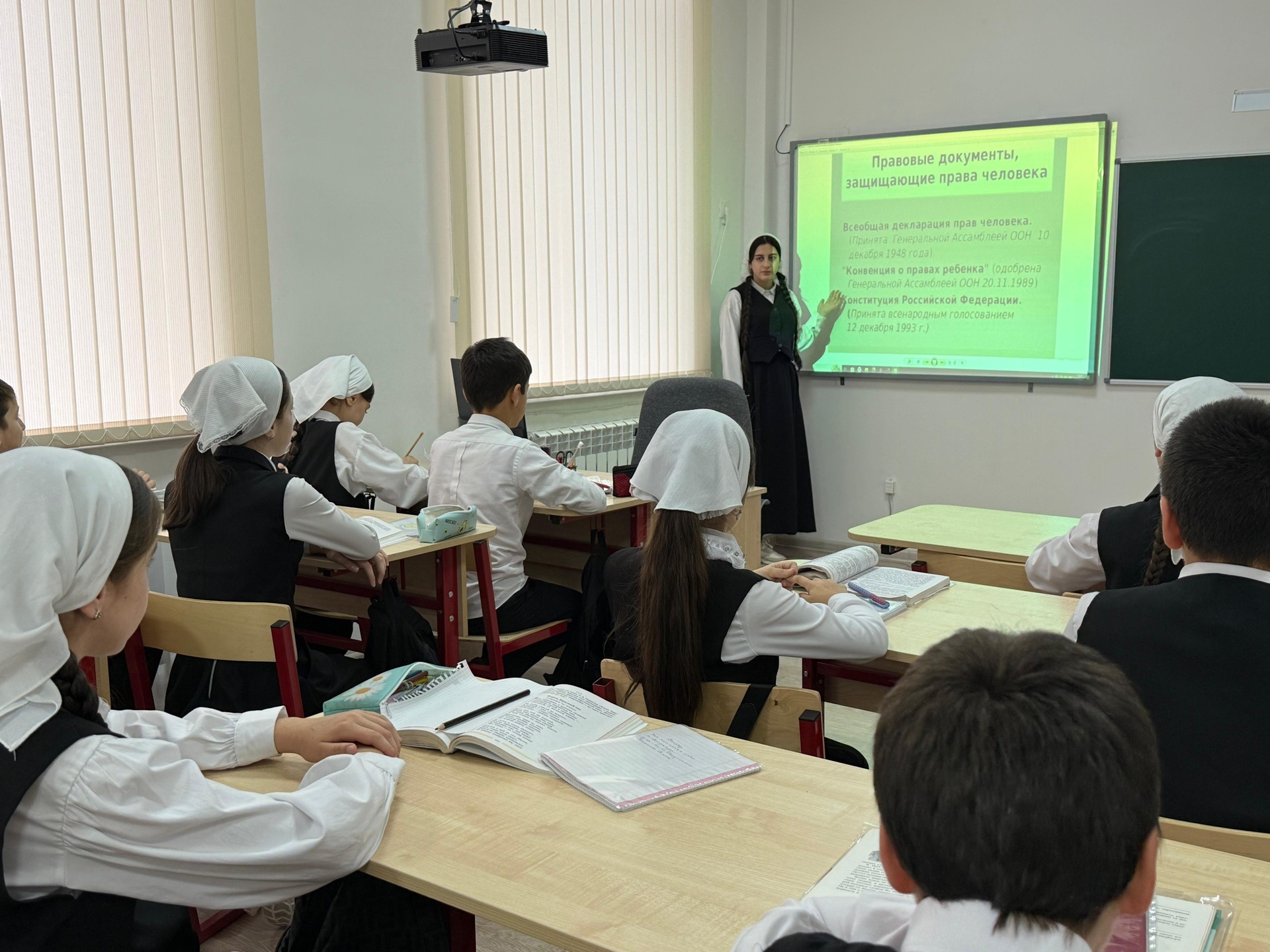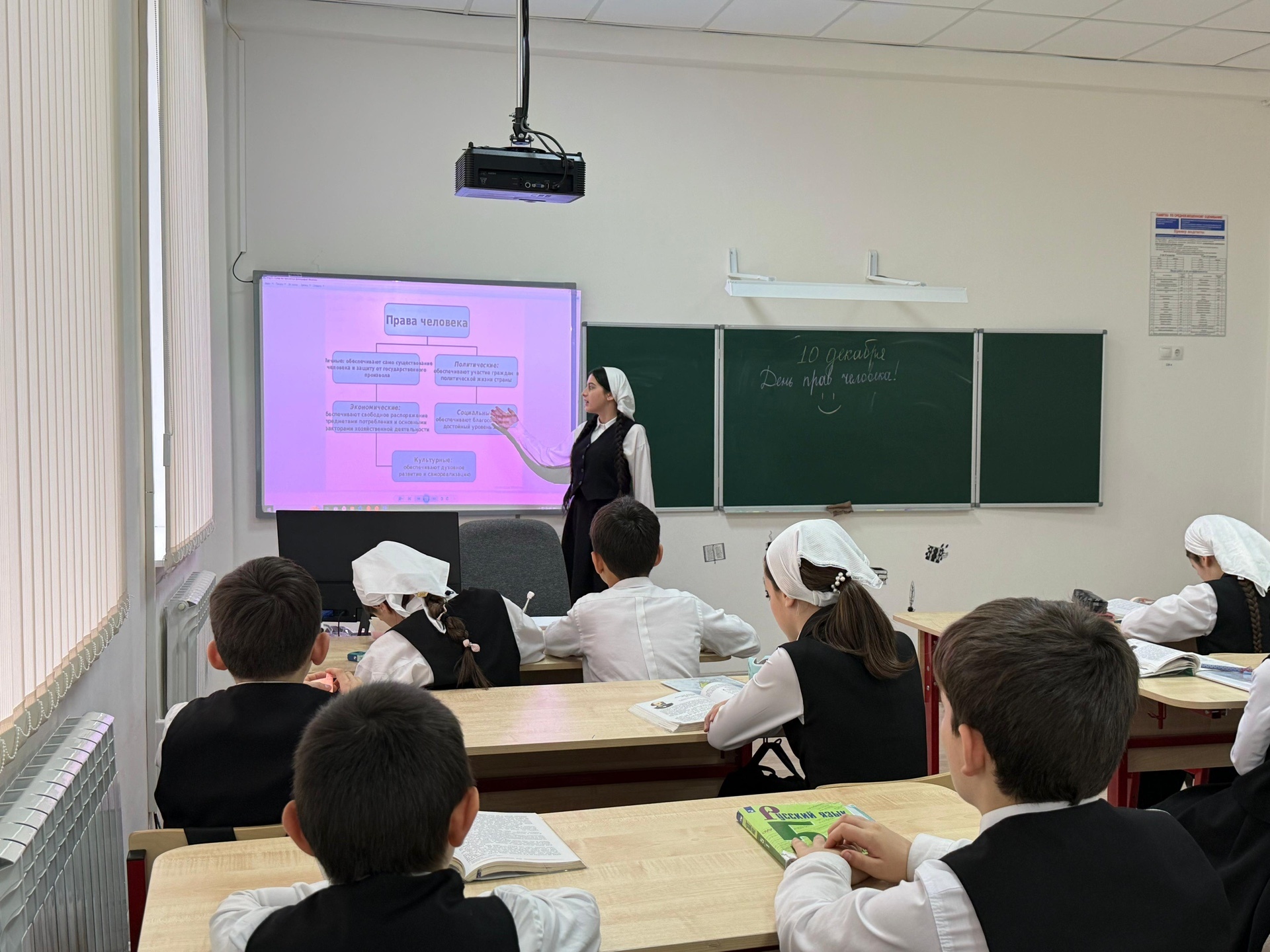 10.12.2025г. В рамках празднования Дня прав человека члены отряда «Юные Кадыровцы» провели просветительскую беседу для учеников 5-х классов.